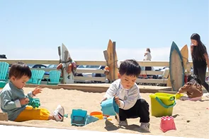 Sand & water play zone—shared buckets for kids, comfy seating for parents with Golden Gate Bridge views.
